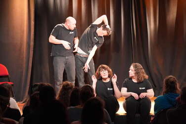 Le public, séparé en 4 groupes, est en charge de coacher l'un des 4 comédiens.